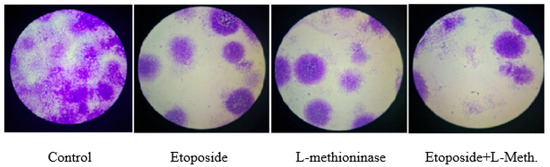 A colony formation assay was performed to evaluate the colony formation ability of U87MG cells [35]. Glioblastoma U87MG cells were cultured in six-well plates, and four different conditions were applied to the cells: the control (no treatment), methioninase treatment, etoposide treatment, and a combination of methioninase and etoposide. Etoposide was administered at a concentration of 40 µM for U87MG cells, and L-methioninase was administered at a concentration of 5.792 units/mL, which corresponded to their respective IC50 values. After 24 h of incubation, 500 live cells were counted with a Neuber hemocytometer and seeded into six-well plates. The cells were incubated for 21 d at 37 °C in a humidified atmosphere containing 5% CO2 for colony formation. The cells were then fixed in 4% paraformaldehyde and stained with 2% crystal violet. Colonies were counted using a Leica EZ50 dissecting microscope (Leica Biosystems, Wetzlar, Germany).