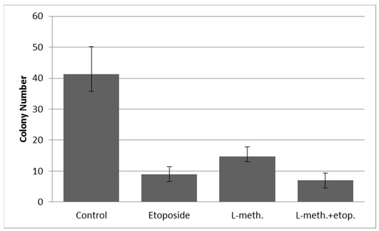Colony number of U87MG cells at the end of 21 days. Combined L-methioninase and Etoposide administration enabled the lowest number of colonies (p < 0.001). L-methioninase is abbreviated as L-meth. Additionally, etoposide is etop.