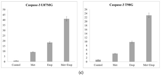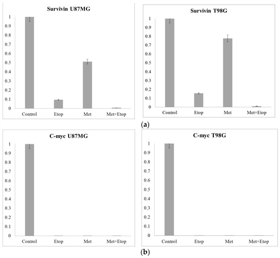Survivin, also known as the baculoviral inhibitor of apoptosis repeat-containing 5 (BIRC5), is an anti-apoptotic protein that is highly expressed in cancer cells, including glioblastoma and contributes to their survival and resistance to cell death [36,37]. It regulates cell cycle progression, prevents apoptosis, and causes chromosomal instability [38,39]. Survivin plays an important role in apoptosis and cell division [40]. Survivin is an anti-apoptotic protein that is responsible for the inhibition of Caspase 3 and 7 [41,42], and the downregulation of survivin expression is associated with cytotoxic conditions [43,44,45]. The overexpression of survivin in cancer cells is a suitable target for cancer treatment [46]. Because of its importance in the regulation of apoptosis, the alteration in mRNA expression was assessed in U87MG and T98G cells subjected to a 24 h culture with L-methioninase and etoposide. The graph in Figure 23a clearly demonstrates a significant decrease in survivin’s expression when treated with L-methioninase, etoposide, and the combined treatment. The combination of L-methioninase and etoposide almost completely inhibited survivin’s expression. The decreased expression of Survivin mRNA following treatment suggests that these treatments successfully target the anti-apoptotic pathway, potentially leading to increased apoptosis and decreased cell survival.