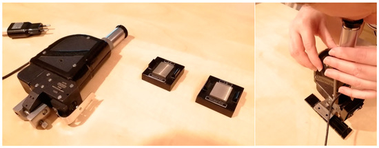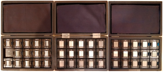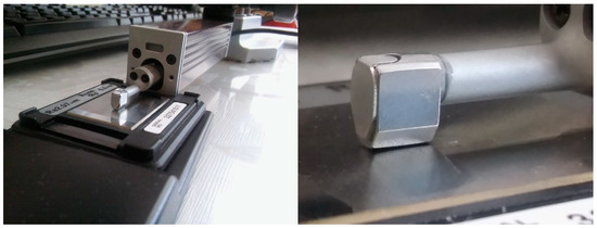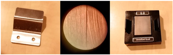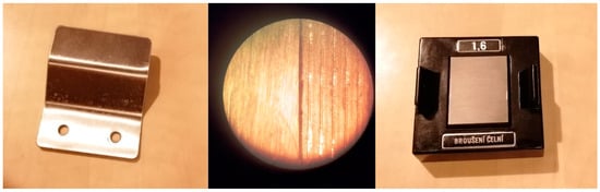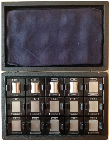 The surface tester used has the function of automatic calibration using secondary surface roughness standards. Secondary surface roughness standards for surface roughness testers, which is a calibration etalon artifact with unidirectional irregular profile of type D1 (according to ISO 5436-1:2000) [36], is recommended for the calibration of the gauge. For this artifact, the value of Ra and Rz is defined. In this work, this function was used, and the calibration process was started before each batch of measurements; after the calibrations, a control measurement was always carried out to verify the calibration process. Likewise, at the end of the measuring dose, a control measurement was carried out to verify the stability of the surface tester calibration. Secondary surface roughness standards for surface roughness testers (Figure 2) were verified by a superior standard in a certified laboratory, and the uncertainty of this used calibration specimen was determined.