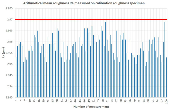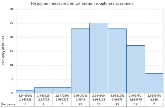 One way to determine the measurement uncertainty is to look at the gauge as a black box and determine the measurement uncertainty from the statistical evaluation of the data measured on the secondary surface roughness standards. For this purpose, 100 measurements were carried out at the same place under unchanged measurement conditions on the secondary surface roughness standard (measured to the standard—ISO 1997 [33]; 0.25 mm/s; Lc = 2.5 mm; X = 5; Gauss). From the measured values, histograms of the frequency of individual intervals of arithmetic mean height of the roughness and standard deviations of the measurement were created.