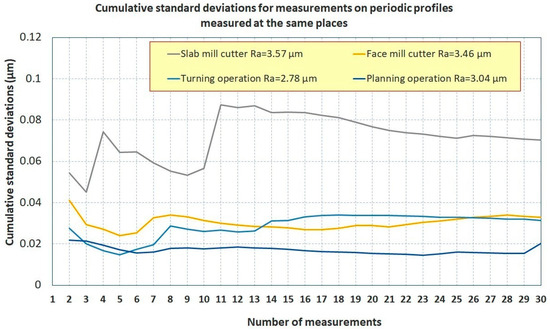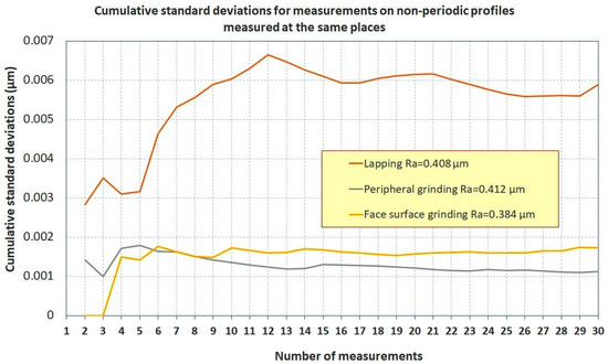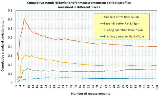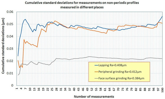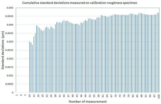 Cumulative standard deviations for 100 measurements at the same place under unchanged conditions (measured to standard—ISO 1997 [33]; 0.25 mm/s; Lc = 2.5 mm; X = 5; Gauss).