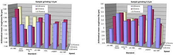 The influence of the selection of the evaluation standard [33,34,35,36,37,38,39,40,51,52,53,54,55,56,57,58,59,60,61,62,63,64,65] and the selection of the sensor movement speed for the 1.6 µm and 3.2 µm samples in the column plotting graph for comparison (conditions: Lc = 0.25 mm; N = 5).