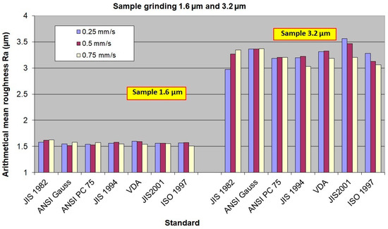 In measurements where the speed of the sensor’s movement did not change, and the standard of evaluation was changed, it can be seen that at a speed of 0.25 mm/s, the evaluations of Ra are most sensitive to the choice of the standard according to which the evaluation took place. For speeds of 0.5 mm/s and 0.75 mm/s, this effect was smaller.
