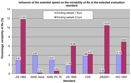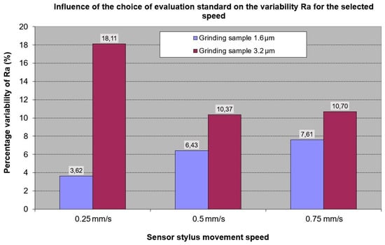 The variability of the data, depending on the selection of the evaluation standard and the speed of the sensor movement, is expressed in percentage terms with respect to the average evaluated values of Ra and is shown in the following figure. The evaluation shows that the variability of the Ra data is in percentage terms up to a maximum of 18% (Figure 8).