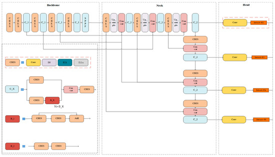 The main network structure of P2E-YOLOv5 network consists of the following three parts: Backbone (backbone network), Neck (neck network), and Head (detection head).