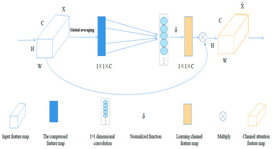 - The input feature map undergoes spatial feature compression: in the spatial dimension, a feature map of 1 × 1 × C is obtained by using global average pooling;