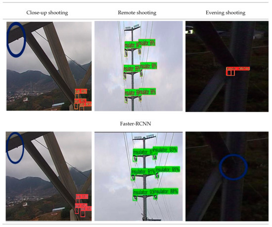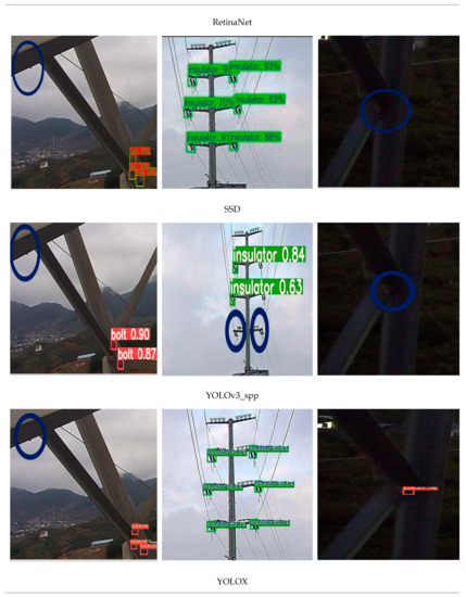 To demonstrate the effectiveness of the proposed model, we conducted a comparative experiment using the existing small-target data set of transmission lines. We selected Faster-RCNN, RetinaNet, SSD, YOLOv3_spp, YOLOX, and YOLOv5 as the comparison network model. The experimental results are presented in Table 2.