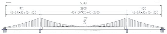 Qiongzhou Strait is one of the three major straits in China, with an east–west length of approximately 80 km and an average north–south width of nearly 30 km. The finite element model used in this paper was based on a design model of a super-long-span suspension bridge over the Qiongzhou strait. The overall span size of this long suspension bridge was 5040 m and its main span was 2800 m. The suspension bridge had a longitudinal floating system with a main tower height of 380 m and main cable sag of 280 m. The cross-sectional area of the main cable on one side was 1.517 m2. The stiffening girder was located in a closed-box girder section. The first phase dead load of the main girder was 221 kN/m and the second phase dead load was 80 kN/m. The layout of the super-long-span suspension bridge is shown in Figure 1.