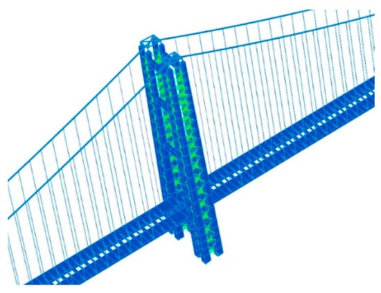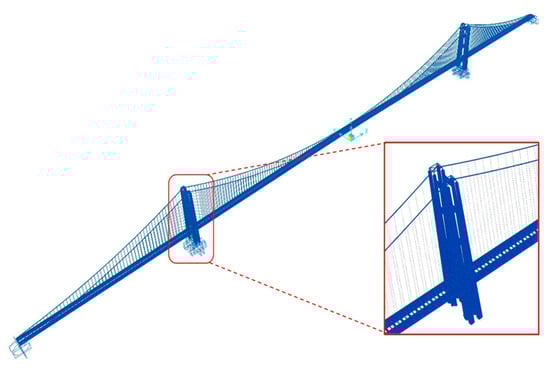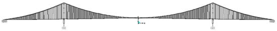 According to the structural characteristics of a suspension bridge, the finite element model of a long-span suspension bridge was established. A three-dimensional (3D) beam element was adopted to simulate the bridge tower and stiffening girder. A 3D truss element was adopted to simulate the suspender of the suspension bridge. A 3D beam element was used to simulate the main cable of the suspension bridge, considering the influence of bending stiffness. A hinged boundary was adopted to simulate the connections between the main cable and the top of the bridge tower, the suspender and the main cable and the suspender and the stiffening girder. This suspension bridge had a longitudinal floating system; the longitudinal displacement constraints between the main girder and the bridge tower were released at the connection of the support. A fixed boundary was selected between the tower and the foundation.
