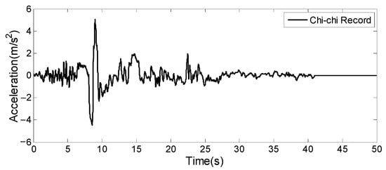 Two far- and near-field ground motions were selected for this study. These were the El Centro (Imperial Valley earthquake in 1940, NS component at station El Centro, shown in Figure 6) and Chi-Chi earthquake records (Chi-Chi earthquake in 1999, EW component at station TCU052, shown in Figure 7), respectively. In the previous studies on seismic response analysis of long-span bridges under near-fault earthquake excitations, Chi-Chi earthquake records in 1999 were often selected and adopted [28,37]. Among the Chi-Chi earthquake records in 1999 from all stations, the EW component seismograms from station TCU052 and TCU068 contained the most typical near-field earthquake characteristics, such as velocity impulsive waveform and large slip displacement [38]. The peak ground acceleration (PGA) of each input ground motion was scaled to 400 gal and 800 gal, respectively. The frequency components of the selected earthquake records were not changed.