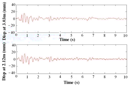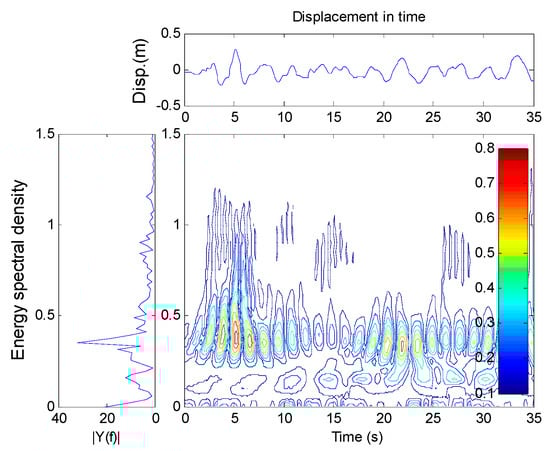 To explain the reason why the seismic responses to the near-field earthquake were greater than those for a far-field earthquake, a time–frequency analysis of displacement at the tower top was performed, as shown in Figure 8 and Figure 9.