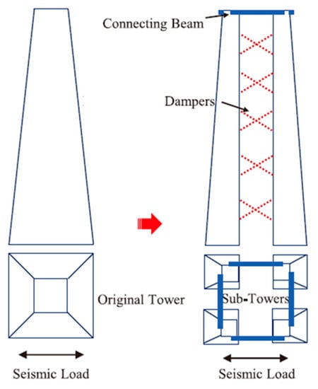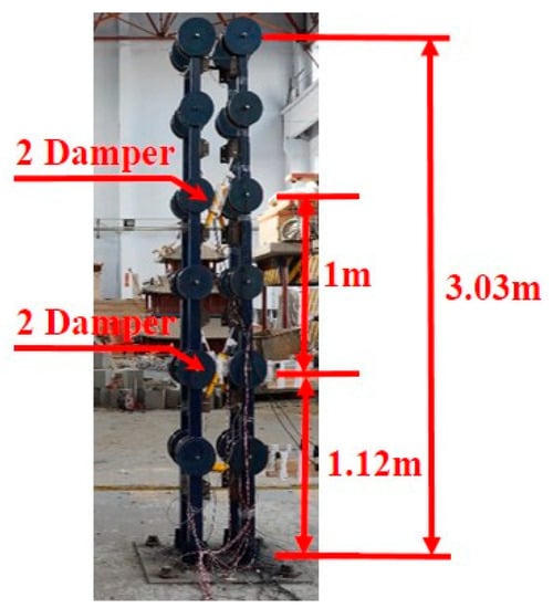 As shown in Figure 14, 72 dampers were installed among the sub-towers along the transverse and longitudinal directions.