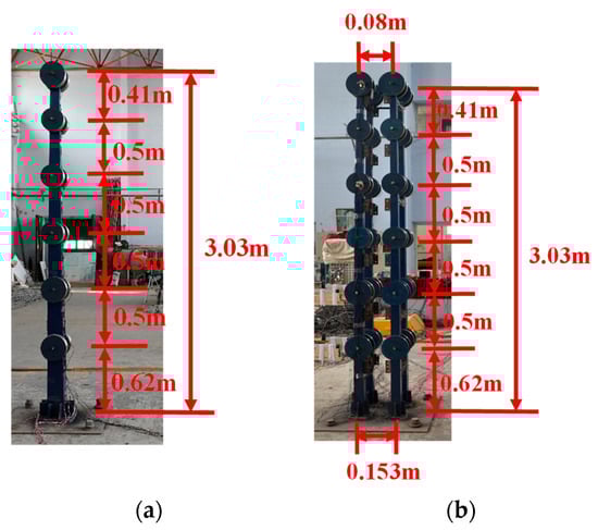 To verify the scheme feasibility of the proposed lattice composite tower and damping system, a shaking-table test of a scaled bridge tower model was then performed, as shown in Figure 12. Limited by shake-table size, the effect of the suspension cable and bridge deck system on the seismic response of bridge tower were not considered in this test. However, through the shake-table tests, a comparison of the dynamic characteristics as well as the seismic response between the original main tower and lattice composite tower could still be directly obtained. In this test, the original tower was manufactured using steel sheets with a thickness of 2.5 mm. The yielding strength was 345 MPa. The overall height of the main tower was 3.119 m. The cross-sections of the main tower were 153 mm × 153 mm and 80 mm × 80 mm at the bottom and top, respectively. Mass blocks of 50, 50, 40, 40, 40 and 50 kg were located at heights of 0.62, 1.12, 1.62, 2.12, 2.62 and 3.03 m, respectively. For the lattice composite tower scheme, the height of the four separate sub-towers was identical to the original tower. The cross-section of each sub-tower was 81 mm × 81 mm at the bottom. At the top, the cross-section was changed to 50 mm × 50 mm. These four sub-towers were located at the four corners of a square, with a cross-section of 220 mm × 220 mm. The mass blocks were equably distributed at the same height in the four sub-towers. The sub-towers were connected together with four connecting beams at the top.