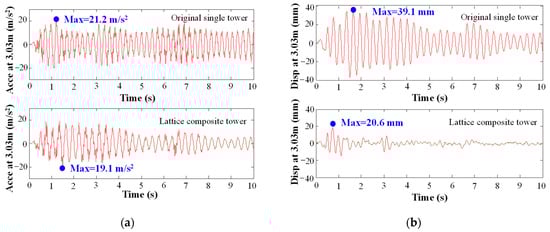 Comparison of seismic responses at the tower top between original main tower and lattice composite tower: (a) acceleration response; (b) displacement response.