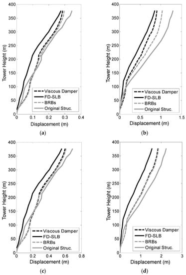 Displacement along the height of the tower with different types of dampers: (a) El Centro, PGA = 400 gal; (b) Chi-Chi, PGA = 400 gal; (c) El Centro, PGA = 800 gal; (d) Chi-Chi, PGA = 800 gal.