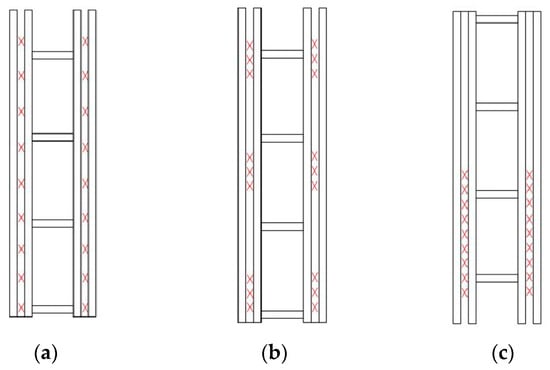 Classical types of damper arrangements: (a) full-uniform distribution; (b) full-trilaminar distribution; (c) bottom-middle distribution.
