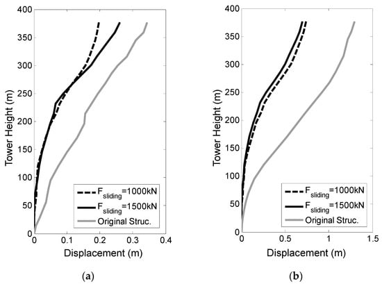 The initial sliding force of the friction damper was selected as one optimized parameter. The initial sliding forces of the friction damper were set to 1000 kN and 1500 kN, respectively. The displacement responses along the height of tower with different initial sliding forces of the friction damper are shown in Figure 20.