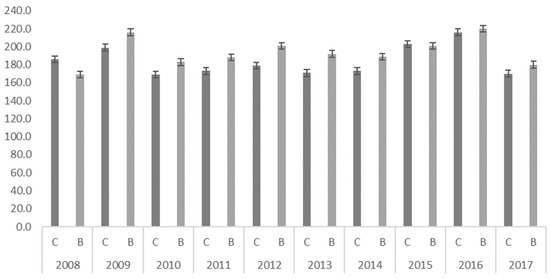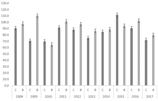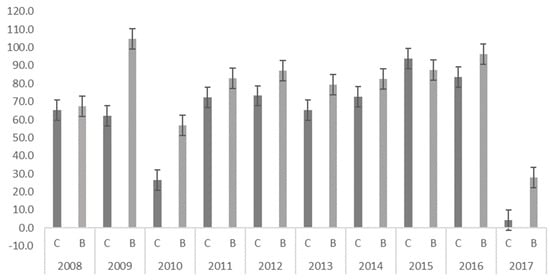 Yield (kg·ha−1) evaluation of apple trees of Golden Delicious cultivar depending on fertilization technology (C—control; B—biostymulation).