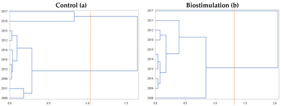 Figure 3 shows a cluster analysis of the percentage of fruit >7.5 cm of Golden Delicious apple trees for the entire study cycle depending on the fertilization technology (Figure 3a for the control combination.; Figure 3b for the biostimulant technology). It was shown that in the case of the control, the years 2010 and 2017 strongly differed from the other clusters (study years), while in the case of the biostimulant technology, only 2017 differed from the other study years. It can be concluded that the application of seaweed-based preparations made it possible to achieve the percentage of large fruit in 2010 at the same level as in the rest of the study period and thus offset the impact of adverse weather conditions on the commercial yield. Similar observations were observed in 2017. According to Takuhara et al. [46], 2011, the CBF3 (C-repeat-binding factor) gene from the brown macroalgae species A. nodosum is activated in response to low temperatures and dehydration and is independent of ABA. Similarly, the COR15A gene regulates cold tolerance by stabilizing chloroplast membranes [47]. The above relationships and influences can be confirmed in the present field observations.