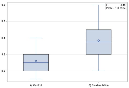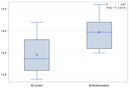 The yield volume of apple trees of the Golden Delicious variety during the 10 years of the study varied regardless of the combination used, from 64.6 t × ha−1 (2010-Biostimulation) to 111.6 t × ha−1 (2015-Control). In 8 of the 10 years of the study, the total yield of trees treated with biostimulant technology was higher than that in the control. Regardless of the combination used, the total yield during the entire study cycle was more than 60 t × ha−1 (Figure 1). The beneficial effect of preparations based on seaweed extracts on the yield quantity and quality was demonstrated by [39,40,41,42,43,44]. The above-mentioned correlations were confirmed in the present study. During the research, a favorable effect of fertilization technology based on seaweed extracts on total yield was demonstrated compared to standard fertilization technology.