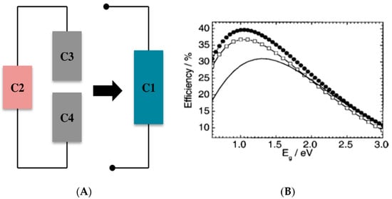 The Shockley–Queisser limit sets the upper bound for the conversion efficiency of a single junction solar cell at 33.7% for a bandgap of 1.3 eV in AM 1.5 G conditions. However, in a research paper, Trupke and colleagues [23] proposed a method to surpass this theoretical limit by applying a downconverter (DC) material on the front or rear surface of a solar cell. They presented an equivalent circuit model of a solar cell combined with a DC layer, which is shown in Figure 3A. The downconverter absorbs high energy photons and is modeled as three solar cells (, , and ) that are connected in series. The solar cells , , and represent the band-band transitions and two intermediate transitions, respectively. is the actual solar cell.