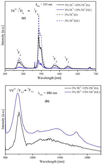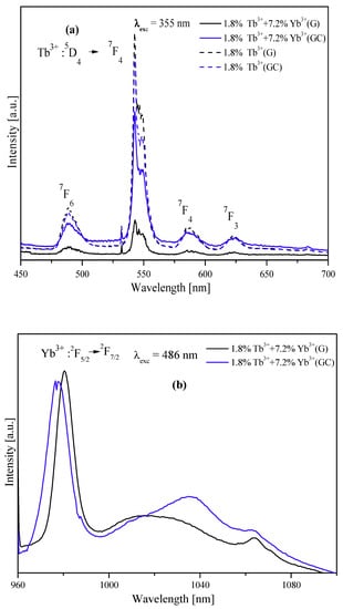 Figure 4 and Figure 5 show the emission spectra of samples G and GC doped with 9% and 15%, respectively, both with and without doping. Analyzing Figure 4a and Figure 5a, we observe emission in the wavelength range of 450–700 nm, attributed to the electronic transitions of ions. The peak of maximum emission is around 543 nm, specifically corresponding to the transition . It is noteworthy that after co-doping, the intensity decreases significantly, indicating the presence of a down-conversion process. Some authors [25] suggest that this process is quantum cutting in glasses co-doped with and , resulting from a cooperative energy transfer that converts a photon absorbed by ions into two photons emitted by ions (. The co-doped samples G and GC exhibit a broad emission band in the near-infrared range, located between 960 and 996 nm, attributed to the transition of , (Figure 4b and Figure 5b). Interestingly, the maximum emission peak for GC samples is at 978 nm, whereas for G samples, it is at 981 nm. This spectral difference between G and GC samples is more pronounced in the infrared region, suggesting a change in the environment surrounding the rare-earth ions after the temperature increase during the heat treatment, attributed to the appearance of HfO2 nanocrystals after annealing at 1000 °C.
