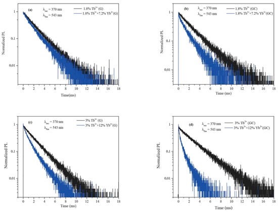 However, it is not possible to determine the conversion efficiency based only on photoluminescence spectra. The evaluation of the energy transfer efficiency between terbium and ytterbium is achieved by estimating the degree of energy transfer between these two ions. This assessment can be carried out by comparing the luminescence decay of terbium with and without ytterbium ion co-doping. The decay curves of Tb3+ ions in the investigated system are illustrated in Figure 6.