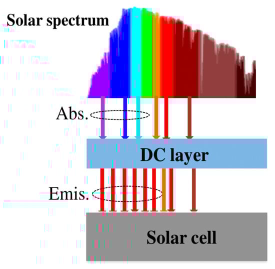 Recently, many efforts in the energy field aim to develop sustainable and renewable energy sources [1]. Indeed, renewable energies can be considered as an inexhaustible, pollution-free and clean source of energy. One of these sources that may be used extensively in the generation of electricity utilizing photovoltaics is solar energy. In reality, the price of photovoltaic systems depends on both the difficulty of industrial production and the efficiency of the cells themselves [2]. The limited efficiency of the photovoltaic (PV) cells or panels is essentially due to the non-absorption of sunlight with energy below the bandgap as well as the thermalization effect due to the absorption of sun effect due to the absorption of sunlight with energy exceeding the semiconductor’s band gap [3], which lead to a theoretical efficiency limit of approximately 30% for silicon based solar cells [4]. One of the keys to overcoming these losses and to obtain higher efficiency is by improving the spectral matching between the broad spectrum of the sun and the band gap of the semiconductor used in PV cells. In order to exploit the whole or maximum solar spectrum, two major solutions were envisaged [5]. The first solution uses multijunction solar cells [6] with several semiconductors having different band gaps which selectively absorb each part of the solar spectrum. The second solution is based on the modification of the solar spectrum to fit the gap of the cell by using down-conversion (DC) and up-conversion (UC) processes (Figure 1). Multi-junction cells can be considered as the most advanced approach since the conversion efficiency of these cells can reach more than 46% [7,8]. Despite its numerous advantages, this approach has a few drawbacks related to the extremely high manufacturing costs [9], tracking problems caused by the sun tracking system [10,11], optical device losses, and concentration problems [12]. Therefore, the use of down- and up-conversion layers offers several advantages, avoiding or reducing these drawbacks [13]. Indeed, the related materials are relatively cheap and can be simply combined with the cell without any radical modification of their architecture, in front for the DC system and in rear for the UC system. For instance, in the DC process, photons in the UV/VIS spectrum are converted into photons with energy appropriate for the solar cell’s bandgap or 1.1 eV for silicon-based solar cells.