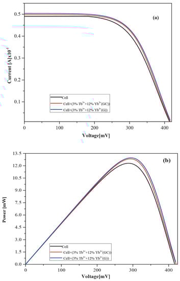 It has been observed that DC layers have been tested on PV cells, but the results have been contrasting. In one study, Florêncio et al. reported a 7% improvement in efficiency for a silicon solar cell covered with 1% Tb3+ doped tellurite (Te-ZnO) glass layer [17]. However, an enhancement of only 1% was observed for a GaP solar cell covered with the same Te-ZnO glass but co-doped with 1% Tb3+-5% Yb3+. For a phosphate glass doped with 0.5% Tb3+- 0.5% Yb3+, the reported PV cell efficiency improvement was 0.34% [18]. Some studies have shown that the efficiency increases when using samples doped with Tb3+ only but decreases when increasing the concentration of Tb3+. However, the purpose of this process is to enhance the efficiency of solar cells. This decrease in efficiency is attributed to either self-absorption and energy transfer between ions [17] or to the concentration quenching of Yb3+ ions for a molar concentration higher than 2% [19].