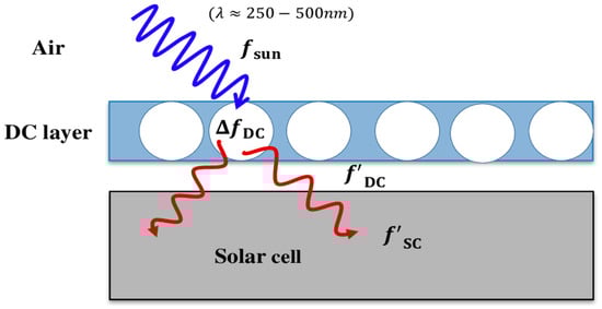 To calculate the , we will define the flux conversion process, as illustrated in Figure 9; in this system, the flux coming from the sun is transmitted through the DC layer, which will then be absorbed by the latter and is converted to 980 nm to directly reach the solar cell .