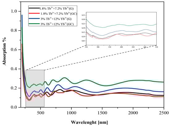 Here, represents the quantum efficiency for Tb3+ ions and is assumed to be equal to 1. From the decay curves obtained in our previous works [22,27] the energy transfer efficiency and effective quantum efficiency have been calculated. The resulting energy transfer efficiency and effective quantum efficiency for two samples glass and glass ceramic co-doped with 3% and 12% are listed in Table 1. These results demonstrate that the effective quantum efficiency values for GC samples are greater than the ones obtained in the G samples. This is attributed to the glass-ceramic matrix’s low phonon energy (700 ), which effectively minimizes non-radiative transitions and enhances luminescence, as indicated in our previous research [22].