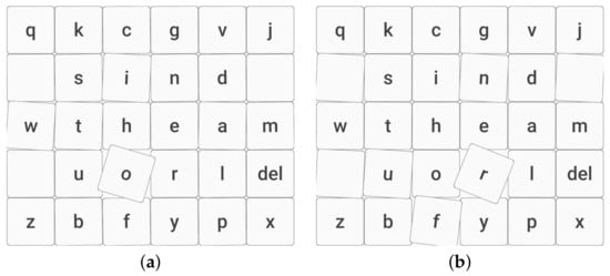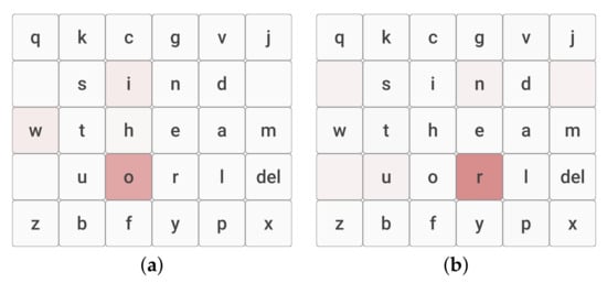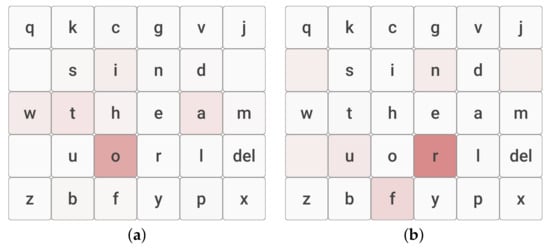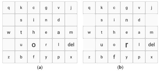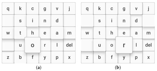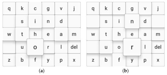The following subsections introduce the different visual clues. To make the clues comparable, the two images per visual clue as in Figure 2a,b always show the same probability distributions. Figures denoted with (a) always represent an iteration, where the most probable key is the “o” key with a probability of 36.82%, followed by the key “t” with a probability of 11.17%, and the key “i” with a probability of 9.25%. Figures denoted with an (b) always represent an iteration where the most probable key is “r” with 47.52%, followed by the key “n” with 18.93%, and the key “f” with 8.89%.