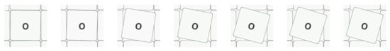 The last dynamic clue is the wiggle animation clue and, differently from the size animation clue and the color animation clue, there is no static clue similar to the wiggle animation clue, as it was discarded after testing. The wiggle animation clue adapts the maximum rotation angle of a rotation animation according to the probability. The overall maximum rotation angle is 45 degrees. Equation (7) shows the formula for calculating the rotation angle. A period of the rotation angle starts at −45 degrees, rises up to 45 degrees, and then returns to −45 degrees. Therefore, the triangle function of the animation is different and adjusted to have a negative part.