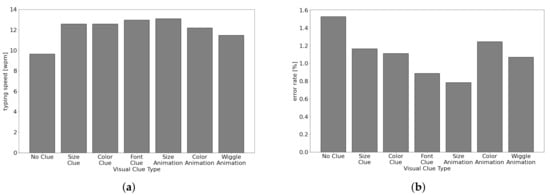 The user study revealed that the size animation clue performed best, as shown in Table 1 and Figure 11. Concerning typing speed in corrected words per minute (wpm), the performance of participants using the size animation clue was 1.07% better than the second-best clue, the font clue, and 4.16% better than the third-best clue, the size clue. Generally, concerning input performance, the ranking was the size animation clue, followed by the font clue, size clue, color clue, color animation clue, and wiggle animation clue. Figure 11a visualizes the results of the user study concerning input speed in words per minute. The differences between the individual visual clues turned out to be smaller than expected. The results of this user study also confirm the work of Magnien et al. [8], because the typing speed improvement overall with visual clues compared to no visual clues was around 30%, which is in line with their observations. The size animation clue led to a faster typing speed than the size clue, while the color animation clue led to a lower typing speed in comparison with the color clue. This leads to the assumption that the animation features do not automatically improve the visual search times, despite the additional feature. In the domain of errors, the results were similar to the typing speed, as shown in Figure 11b.