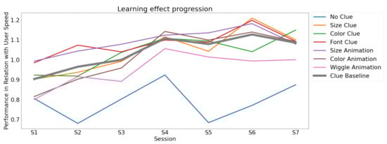 While observing the user study, it became visible that some users heavily rely on over-performing visual clues. This became clear when they faced the Opti layout without visual clues. Now, it would be interesting to see if this reliance on visual clues hinders learning the layout. This would mean that the user would never be an expert typist, reducing the positive effect of the Opti layout. Figure 12 shows how the learning progression looks in the experiment of this paper. The figure shows the typing speed averages across the different sessions. Due to the design, a single point for a single session of a single visual clue and no clue only corresponds to four participants, making this figure only indicate possible trends toward this question. But it gives an idea of what the initial problem is. It is visible that the blue line, indicating no clues, is not really steadily going up as is expected with a learning effect. Session five, in particular, is worse knowing that the participants interacted with the new layout four times before. With the visual clues, this is different. The changes are much smaller and not decreasing between sessions that extremely. The dark gray baseline clue is the average across all clues and it is visible that it is steadily increasing as is expected with the learning effect. This could indicate that the keyboard layout is not really learned by some of the participants, making the use of visual clues counterproductive. This may also mean that the prediction model should not be perfect, as with a more erroneous prediction the users may be able to learn the layout more efficiently and rely less on the visual clues. Therefore, the prediction performance has to be in a small bandwidth.