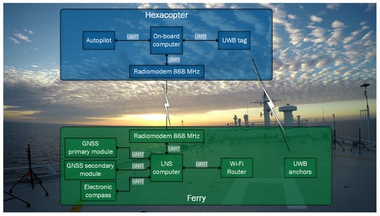 An overview of the proposed tethered hexacopter system is presented in Figure 1. The two main components of the system were: the aerial part, i.e., the systems used on the hexacopter, and the water-based part, installed on the landing deck of the ferry. The diagram highlights the relationships and connections between the subsystems, while detailed specifications are provided in the subsequent sections.