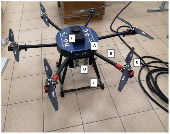 In Figure 2, the frame of the multicopter (Figure 2A); one of the six arms (Figure 2B); the drive unit consisting of a propeller, a BLDC motor, and an electronic speed controller (Figure 2C); the converter power supply system (Figure 2D); the landing gear (Figure 2E); and the control system comprising an autopilot with a GNSS receiver (Figure 2F) are presented.