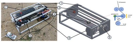 Structure of the power cord unwinder: 1—frame, 2—winding roll, 3—guiding trolley with tension sensor (potentiometer), 4—AC asynchronous triple-phase motor, 5—belt transmissions, 6—damper, 7—50 m of power cord. On the right-hand side, there is a picture that presents the concept of tension measurement by the potentiometer.