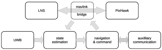 The components can be briefly described as follows. The mavlink bridge component forwarded the messages sent upstream from the LNS to the autopilot and extracted information about the base station’s position and the desired UAV position from additional custom packets inserted into the stream. The bridge also forwarded downstream packets from the autopilot to the LNS and extracted the state information of the UAV. The state information, including the position estimate obtained through the UWB component, was processed in the state estimation component, where the precise position of the UAV with respect to the base station was calculated. The state estimate was further used by the navigation and command component to compute the desired steering of the UAV. The additional auxiliary communication component was also available to process diagnostic information and logging.