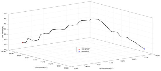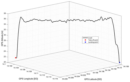 The tests were carried out in the winter season in February. They took place on a real facility—the “Wolin” ferry traveling from Swinoujscie (Poland) to Trelleborg (Sweden) according to its daily schedule. During the cruise, despite the fact that it lasted about 7 h, the convenient window for the test was very narrow due to, e.g., leaving and arriving at port, passing wind farms or forbidden zones, bad weather, and dusk (when flight tests should not be carried out). During the window of possible tests, additional calibrations or parameter changes often had to be performed, which took up valuable time. Finally, on a given day, six flights of different durations and altitudes were conducted. The hexarotor in flight above the ferry deck in real sea conditions is shown in Figure 10. The ambient conditions during the aerial mission were as follows: