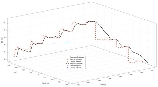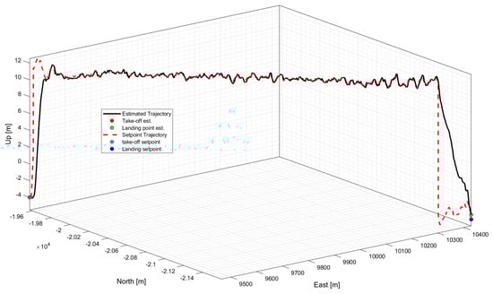 During the ferry cruise described above, a number of hexarotor flight tests were carried out to check the most important components of the UAV system (local control and stabilization system, positioning system, navigation system, landing-pad-following system, etc.). The results of two sample tests are shown in Figure 11, Figure 12, Figure 13, Figure 14, Figure 15, Figure 16, Figure 17, Figure 18, Figure 19 and Figure 20. The first test presented was conducted to verify if the tethered hexacopter followed the landing pad and ferry over a long distance and in difficult weather conditions. The second trial was designed to test the quality of hexacopter altitude tracking in a simulated UAV observation altitude change scenario. Figure 11 shows the 3D hexarotor trajectory realized during the first test. The take-off and landing points as well as the climb and descent curves are presented and can easily be identified. The total distance covered by the hexarotor during this test was 2.26 km. The average speed over this distance was 23.5 km/h. The hexacopter’s trajectory, in the east-north-up (ENU) local coordinate system, is also shown in Figure 12. The UAV’s estimated position is compared with the desired trajectory. The hexarotor, despite the difficult conditions, correctly and accurately followed the desired trajectory. Additionally, the take-off and landing setpoints with current values are also marked in Figure 12. The hexarotor’s attitude, expressed by roll, pitch, and yaw angles, is shown in Figure 13. The roll angle during the entire cruise was kept at about 8 degrees, while the pitch angle was about degrees. The yaw angle was about 150 degrees, except for the take-off and landing phases, when the hexarotor was close to the ship’s metal deck. The ship’s large metal superstructure distorted the readings of the UAV’s onboard magnetometer. The linear velocities of the propeller are shown in Figure 14. These velocities were used as control signals in the landing pad tracking system. In addition, the ground speed is shown for comparison. The hexarotor followed the desired speed values very precisely, except for the critical take-off phase due to disturbances of the magnetometer and disturbances from gusts of wind, which were intensified at relatively low altitudes close to the deck (air streams were reflected from the deck surface and hit the hexarotor—the ground effect). The magnetometer readings during the test are shown in Figure 15. It is easy to see the effect of the proximity of the vessel’s metal deck on the operation of the magnetometer and the determination of the yaw angle.