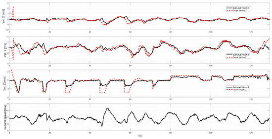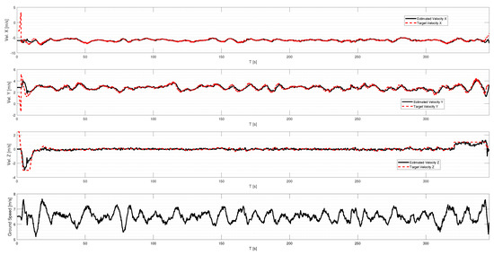 Tethered hexacopter linear velocities and ground speed during the long-term following test.