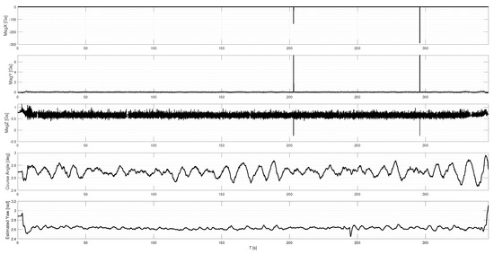 The most important issue concerned the magnetometer readings on the ferry’s landing pad. Varying drift from the real magnetic north, which decreased with a flight altitude increment, was observed, especially on the plots of the magnetometer z-axis readings just after take-off and just before landing (Figure 15 and Figure 20, respectively). Moreover, the z-axis readings of the magnetometer were very noisy in comparison to the x- and y-axis readings. Of course, the problem’s source lay in the material from which the ferry’s structure was made. Steel is a ferromagnetic material, which interferes with the weak magnetic field of the Earth. The magnetometer was the most crucial device among the hexacopter onboard equipment, because it was the only source of heading that was required to track the landing pad’s position while the ferry was cruising. At the low cruise speed of the ferry, the GNSS heading readings were unreliable. During the tests, a solution to this problem was found, which included magnetometer recalibration before each take-off. Thus, our conclusion was that the automated process of flight management, especially if it has to be carried out by the computer of an autonomous vessel, must include a flight preparation phase responsible for magnetometer tests and recalibration.