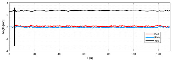The second test involved checking the hexacopter and its navigation system in an observation scenario at various altitudes under difficult sea conditions. Changing the flight altitude (ascending, descending) while following the vessel in windy conditions and operating from the vessel’s helipad was a challenge. The vessel’s structure intensified wind disturbances and gusts, and numerous air chimneys were noted in the vicinity of the vessel’s landing pad. Similarly to the results of the first long-distance test, the UAV’s trajectory and the most important flight parameters are shown in Figure 16, Figure 17, Figure 18, Figure 19 and Figure 20. In Figure 16, the hexacopter’s trajectory during the second test is presented. It is easy to see the changes in altitude intentionally triggered in the control system. During the second test, the hexacopter covered a distance of almost 900 m, with an average speed of 25 km/h. The hexacopter’s trajectory in the ENU local coordinate system is also shown in Figure 17. Here, the set values of the trajectory and the estimated position in the local frame in the ENU reference system can easily be compared. It can be seen that the quality of tracking the desired trajectory was satisfactory, despite the difficult weather and environmental conditions. The roll, pitch, and yaw angles during the second test are shown in Figure 18. The average value of the roll angle during the test was 6 degrees, while the pitch angle was about degrees. The yaw angle during the entire test was 150 degrees, with a jump to degrees in the initial phase of the test (just after the start). This was caused by large changes in the magnetic field in close proximity to the vessel’s metal deck. Control system quality evaluation could also be carried out by analyzing linear velocities (desired and measured values). These are shown in Figure 19. The control system followed the setppoint properly. The largest changes in the setpoint could be seen in the z-axis velocity component. This was caused by forced changes in the altitude setpoint. As in the previous test, the magnetometer readings are presented in Figure 20. It is easy to see the effect of the proximity of the vessel’s metal deck on the operation of the magnetometer and the determination of the yaw angle.