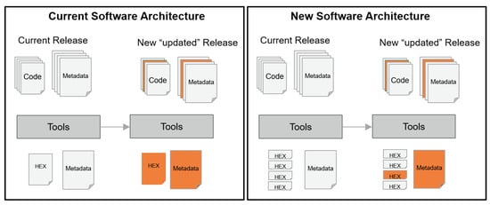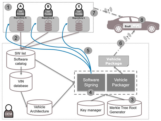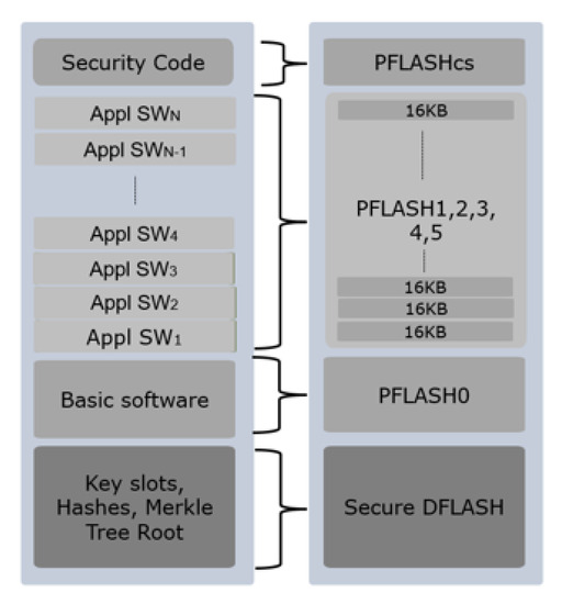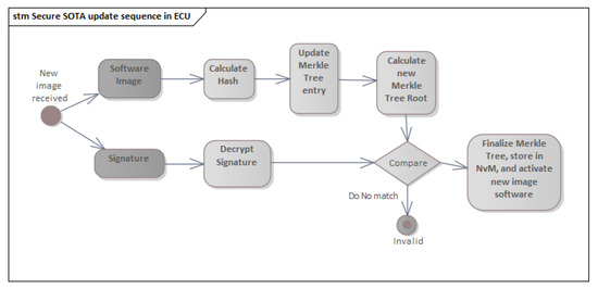 Software updates over the air (SOTA) have gained high interest in the automotive industry. An electronic control unit (ECU) can only run a new version of received software after empirically verifying that it has successfully received the entire correct image file from the repository. Software updates need to be applied across a distributed system of automotive devices, which can be designed and serviced by different suppliers. The original equipment manufacturer (OEM) must shift from the traditional vehicle architectures toward the more flexible and scalable approach required for the next generation architecture. Software-defined vehicles are the next evolution of the automotive industry [1]. New automotive trends such as e-mobility, automated driving, and connectivity services are made possible mainly by software. Main features and operations will be enabled and managed by software. Software updates not only allow for fixes of software defects or bugs but also enable management of new and paid features provided as a service throughout the entire life cycle. The change in business model is made possible by the separation of hardware and software. Significant variation is expected across the vehicle’s various software. ECU software is becoming more similar to mobile software when different packages are provided separately and need to be integrated together in the vehicle. Virtualization, cloud-based approaches, AUTomotive Open System ARchitecture (AUTOSAR), and adaptive and flexible classic multi-layer software architecture [2,3] are examples which split today’s binary image into several software binary images which can be independently developed, integrated, tested, released, and programmed on the target ECU (Figure 1).