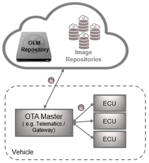 OTA System Architecture: The OEM and image repositories contain all the information about the software update process and the software images to be wirelessly transferred to the vehicle. The OTA Master manages the update process for all ECUs within the vehicle. It receives the images from the repositories and transfers the image to the target ECU.