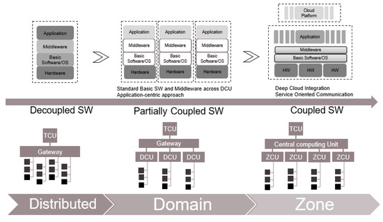 The E/E architecture is going through fundamental changes. Driven by software-defined vehicle architecture, the vehicle is evolving into ECUs in which new functions and features are implemented and deployed primarily through software. The adaptation of the vehicle-centralized, zone-oriented E/E architecture takes place as an iterative process, introduced gradually in the vehicle. The E/E architecture transitions from being a decentralized system, connected by a central gateway in which functions are running on dedicated ECUs with software binding to hardware, towards more centralized systems with dedicated domain controllers handling a set of functions related to a specific area or domain before evolving into zonal controllers arranging functions according to their positions in the vehicle [23]. Throughout this transition, significant variation is expected across the various vehicle software. As shown in Figure 4, the software evolution goes in parallel with hardware evolution. The majority of software in decentralized architecture is combined with a function-specific ECU in a single package and fully controlled by OEMs. A typical new-generation vehicle likely has an architecture composed of five or more domains. The functions are abstracted from discrete ECUs and centered in software in fewer hardware modules. Domain-specific functions are optimized for their application and distributed flexibly to any cross-domain vehicle controllers and no longer tied to a particular ECU. High performance computing ECUs and service-based approaches (e.g., service-oriented communication) are essential for the zonal architecture. Software services can be subscribed across application and ECU boundaries. Signal-based real-time-controlled software continues to be used for sensors and control actuators. Due to the disruption in the E/E topology, OEMs cannot change the complete vehicle setup quickly and the transition will take place at different rates depending on OEM strategies. Therefore, legacy classical ECUs will remain part of the vehicle, and a mixed architecture will be implemented in tomorrow’s vehicles. An application software entity can be placed either in a central computing controller, a zonal controller, a domain controller, or a persistent specialized ECU (e.g., actuator, sensor).