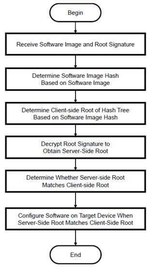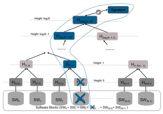 Figure 8 summarizes the steps performed in the ECU to verify the signature. Verification is a bottom-up approach where it starts from the leaf node of the received software cluster (SW) and goes through the proof path to obtain the top root of the tree. Updating the Merkle tree follows the same method at OemR and EcuX once the leaf nodes are updated with the new hash values. The main difference is that OemR obtains the hash value of the software image from ImgR as OemR does not have access to the software image itself, while EcuX calculates the hash value of the software images if the software cluster belongs to it. Otherwise, it retrieves it from OemR.