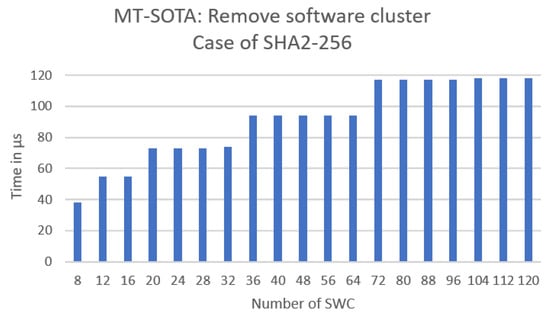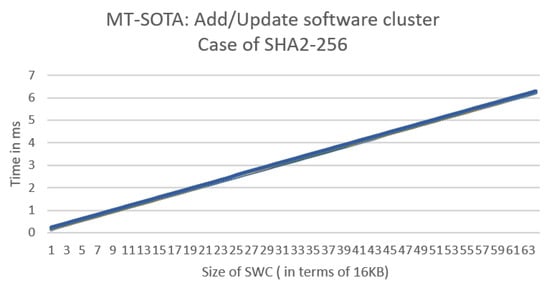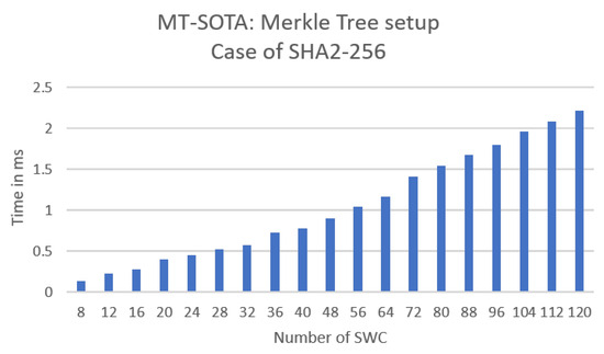 As demonstrated by this work, the MT-SOTA scheme accelerates the process of updating a software cluster. During the creation and configuration of the Merkle tree, each leaf node involves the hashing of its corresponding software cluster or block. This procedure can be time-consuming during the initial startup, especially when the software’s size is substantial. Nonetheless, this is not a significant concern, as it occurs only once during the ECU’s initial power-on. To enhance setup efficiency, a solution could involve pre-flashing and pre-installing Merkle-tree leaf nodes into the ECU, along with the initial software (e.g., during end-of-line programming). This step would eliminate this task from the ECU and potentially expedite the setup time. In this case, there is no need to calculate the hash of each individual software cluster, and the Merkle tree can be setup in the ECU at a negligible cost as shown in Figure 14.